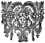 Description: Woodcut ornament, bust surrounded by palm fronds and coconuts.