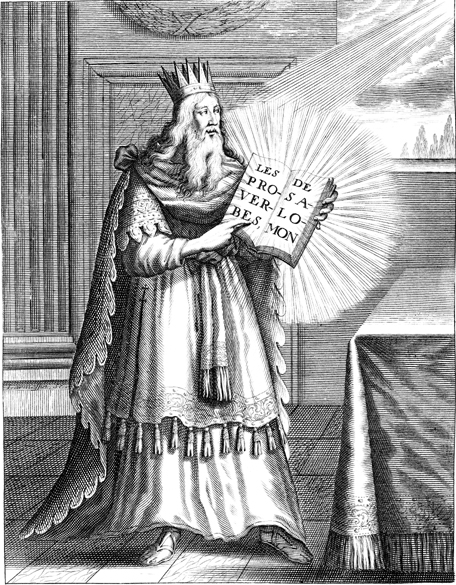 Description: An engraving of Solomon, robed and crowned, standing before a table and holding open a book that reads “Les proverbes de Salomon.” The light of God comes in through the window and illuminates the book.