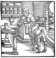 Description: A rendering of St. Luke at his writing desk with his attribute, the bull nearby.