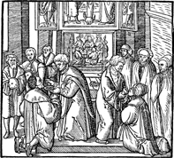 Description: The Eucharist is celebrated beneath images of the Last Supper and crucifixion.