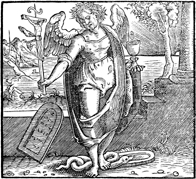 Description: An angel, representing faith, steps on a snake with Ten Commandments on the ground and a crucifix and chalice in hand.