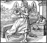 Description: An angel stands next to a man in bonds.