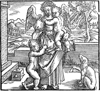 Description: An angel, repressenting care, with dog at feet holds to young children.