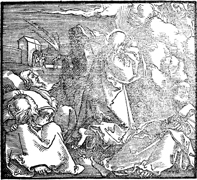 Description: Jesus prays that his cup may pass as the inner circle sleeps. In the background, the soldiers arrive to arrest Jesus.