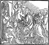 Description: Jesus rides into Jerusalem on a donkey to the waving of palm branches.