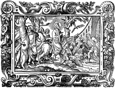 Description: Jesus rides into Jerusalem on a donkey to the waving of palm branches.