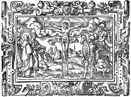 Description: Jesus hangs on the cross as Mary, the beloved disciple, and two soldiers look on.