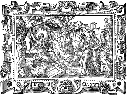Description: An angel tells the women that Jesus has risen from the dead. Three crosses are depicted in the background.