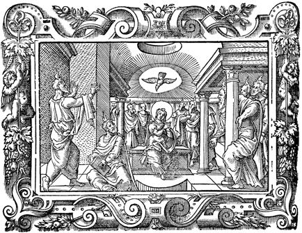 Description: The Holy Spirit descends upon the believers in the form of a dove and as flames of fire on Pentecost.