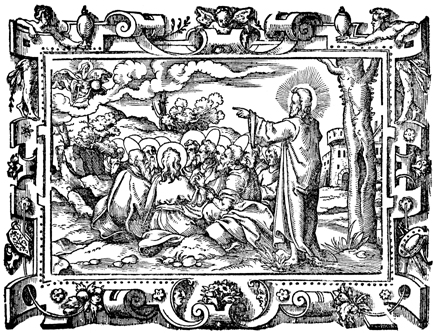 Description: Jesus teaches his disciples about God the Father, who appears with orb in hand above.